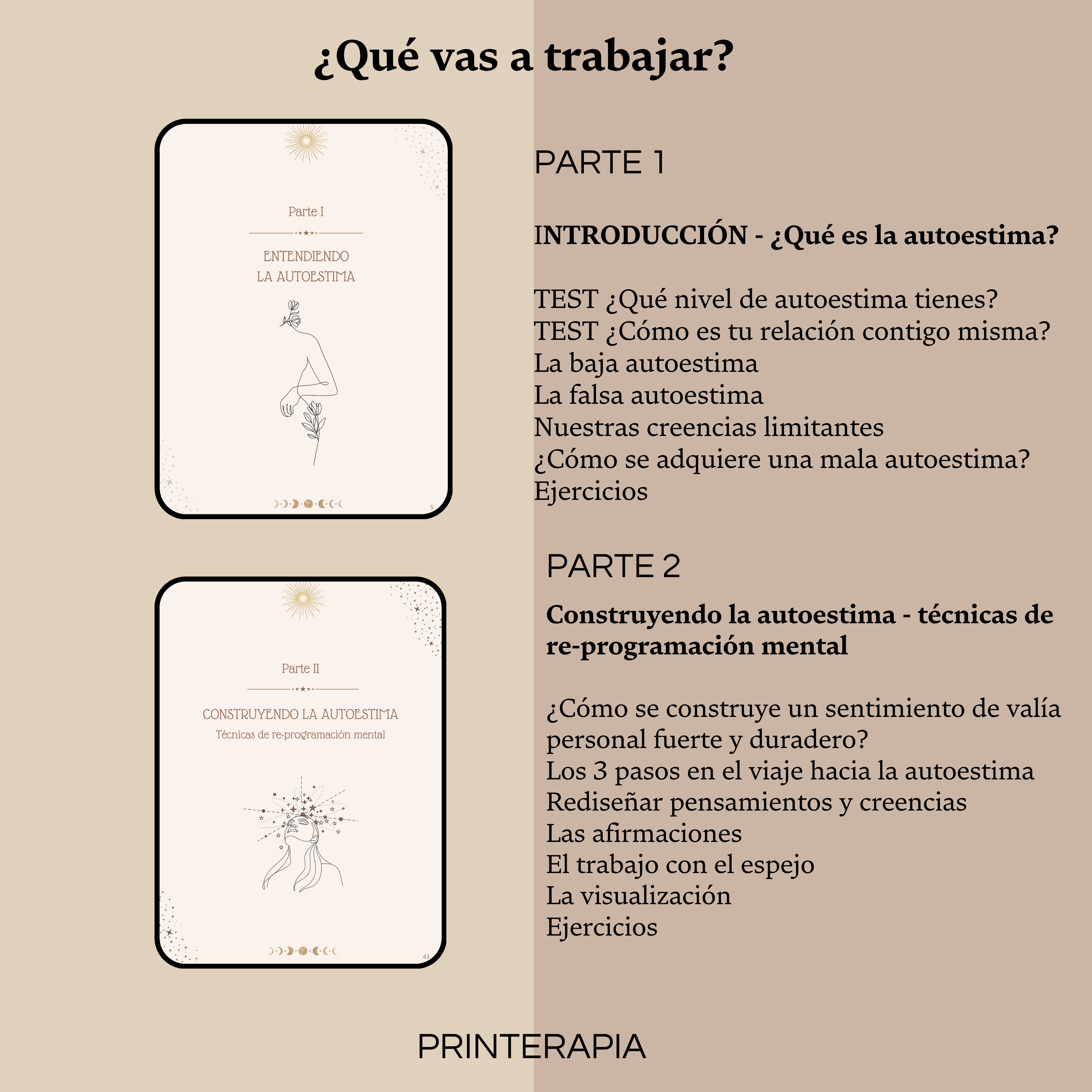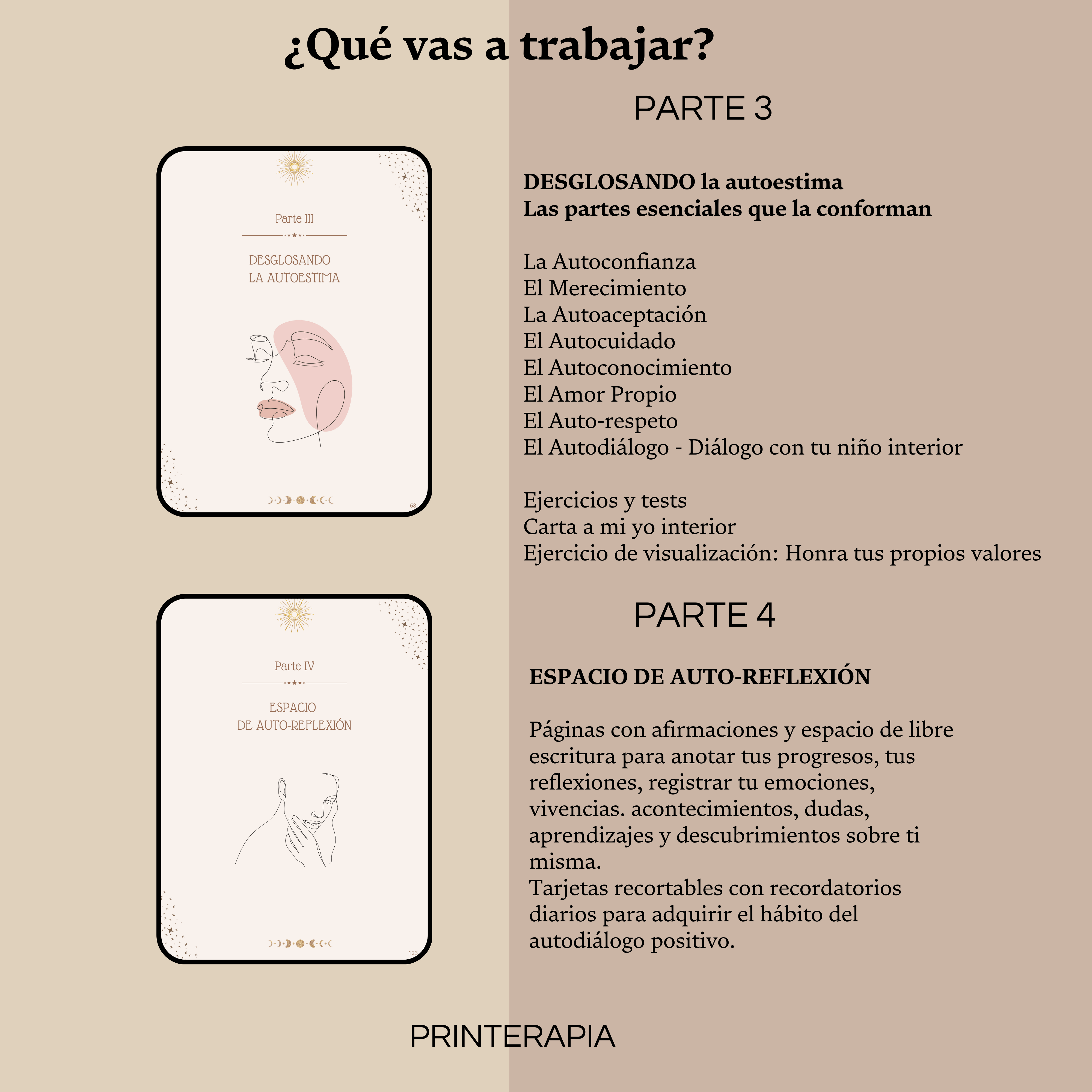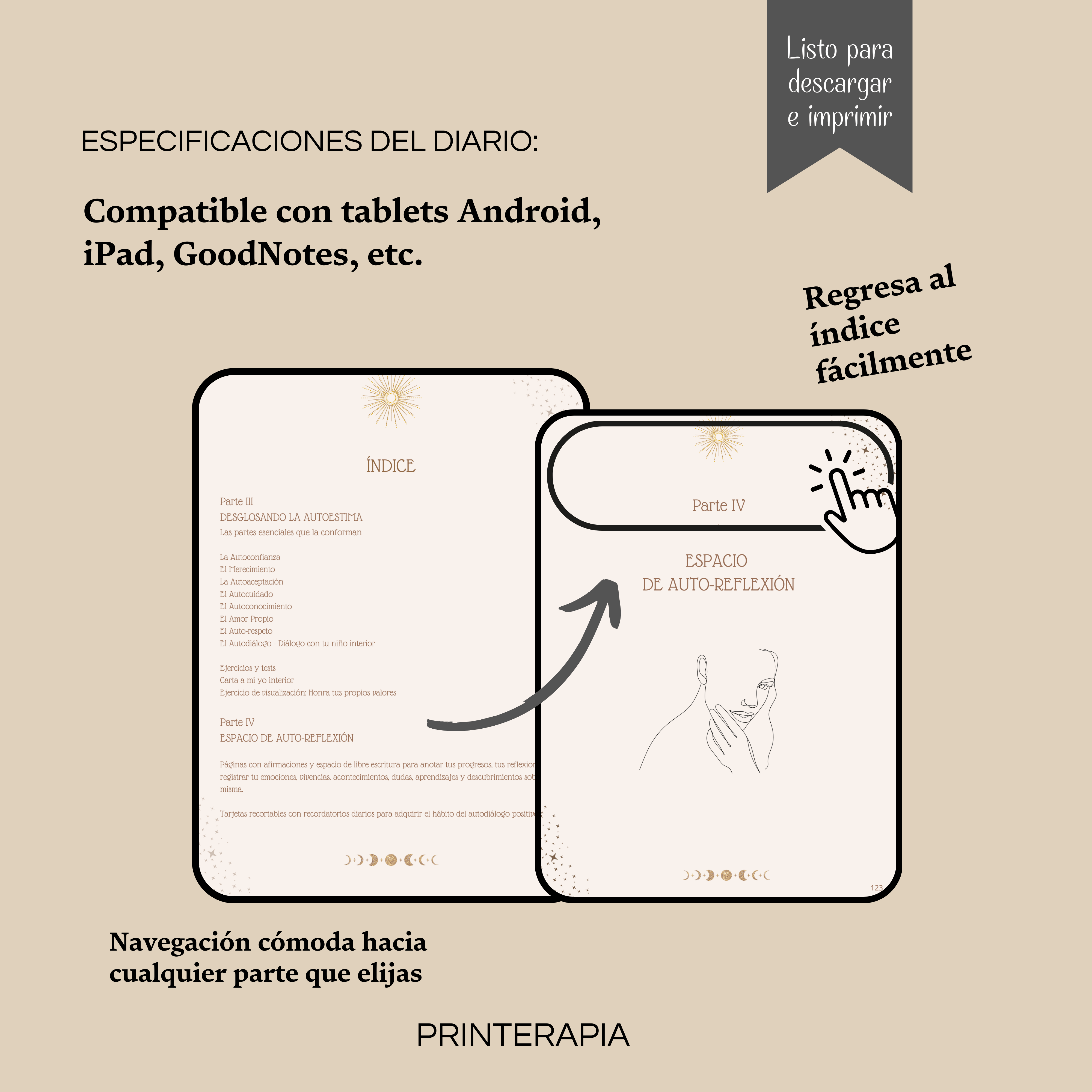 Diario de Autoestima, 220 páginas. Una descarga digital que te abrirá el acceso instantáneo a recursos valiosos para fortalecer tu autoestima y entrenar tu autoconfianza. Con este diario, iniciarás tu propio viaje terapéutico desde la comodidad de tu hogar, equipada con efectivas herramientas de autoconocimiento y gestión de emociones.