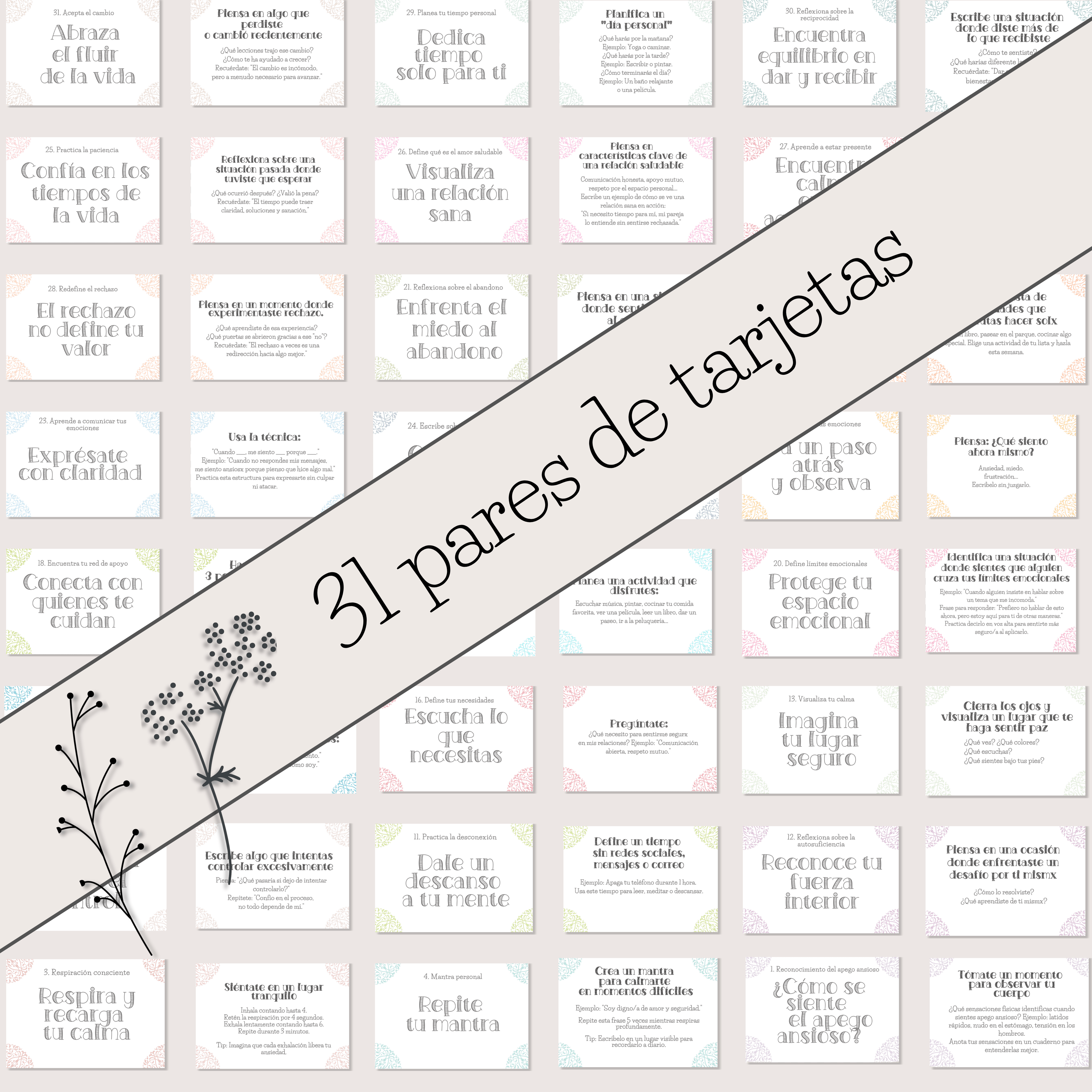 Este set incluye 31 tarjetas prácticas diseñadas para ayudarte a manejar la ansiedad, mejorar tus relaciones y reconectarte contigo mismx. Cada tarjeta contiene un ejercicio simple, basado en técnicas de autocuidado, mindfulness y desarrollo personal, ideal para quienes buscan fortalecer su bienestar emocional y trabajar en su apego ansioso.