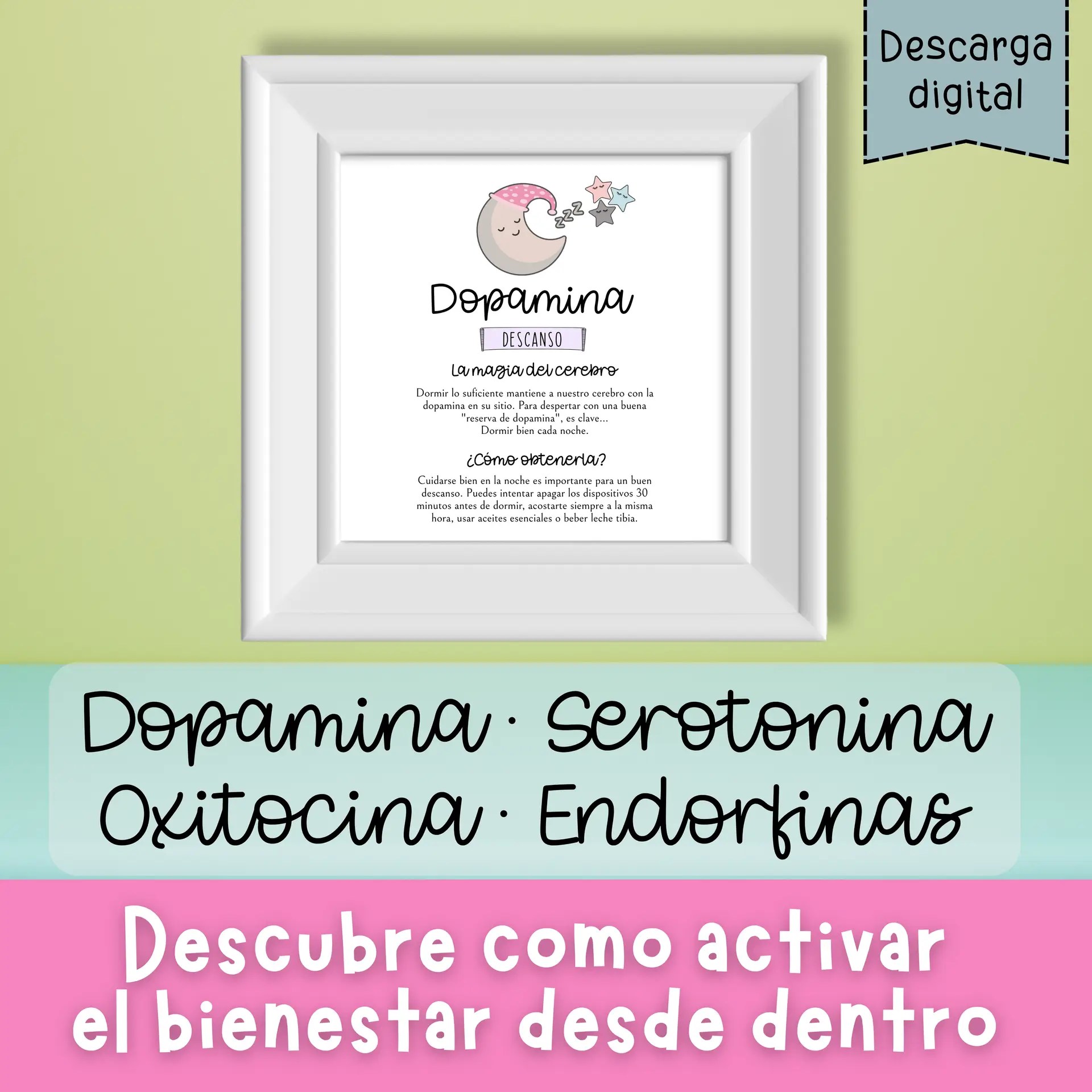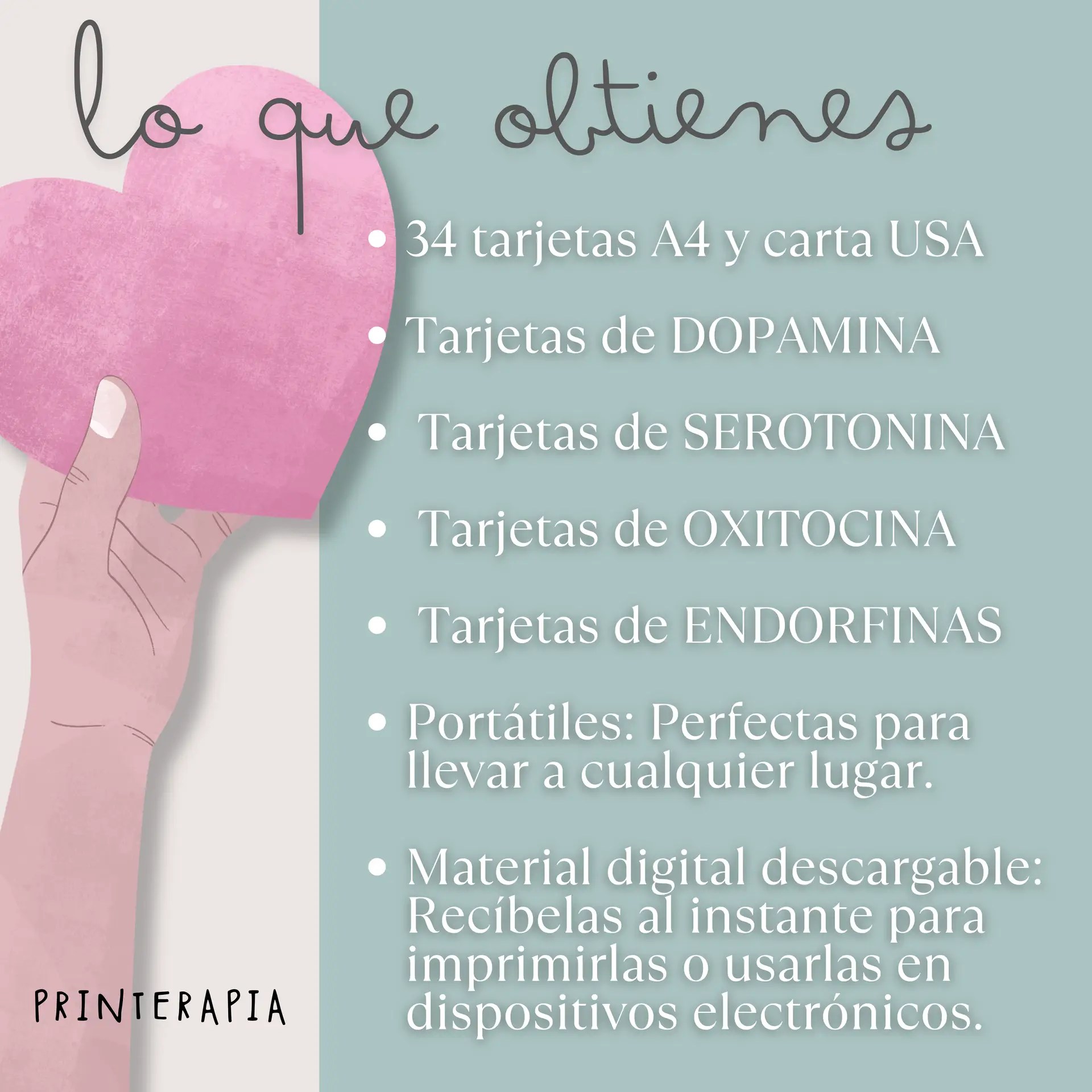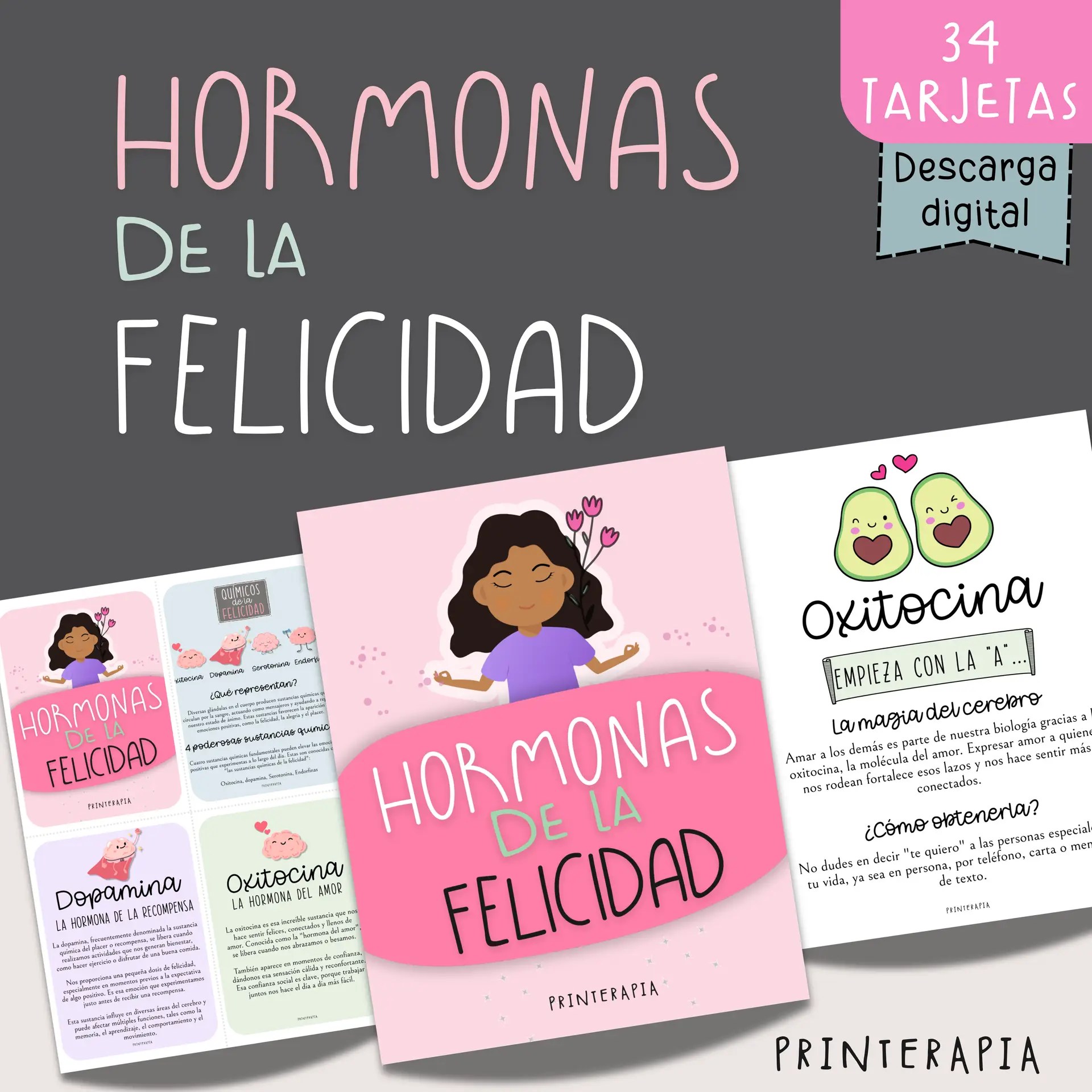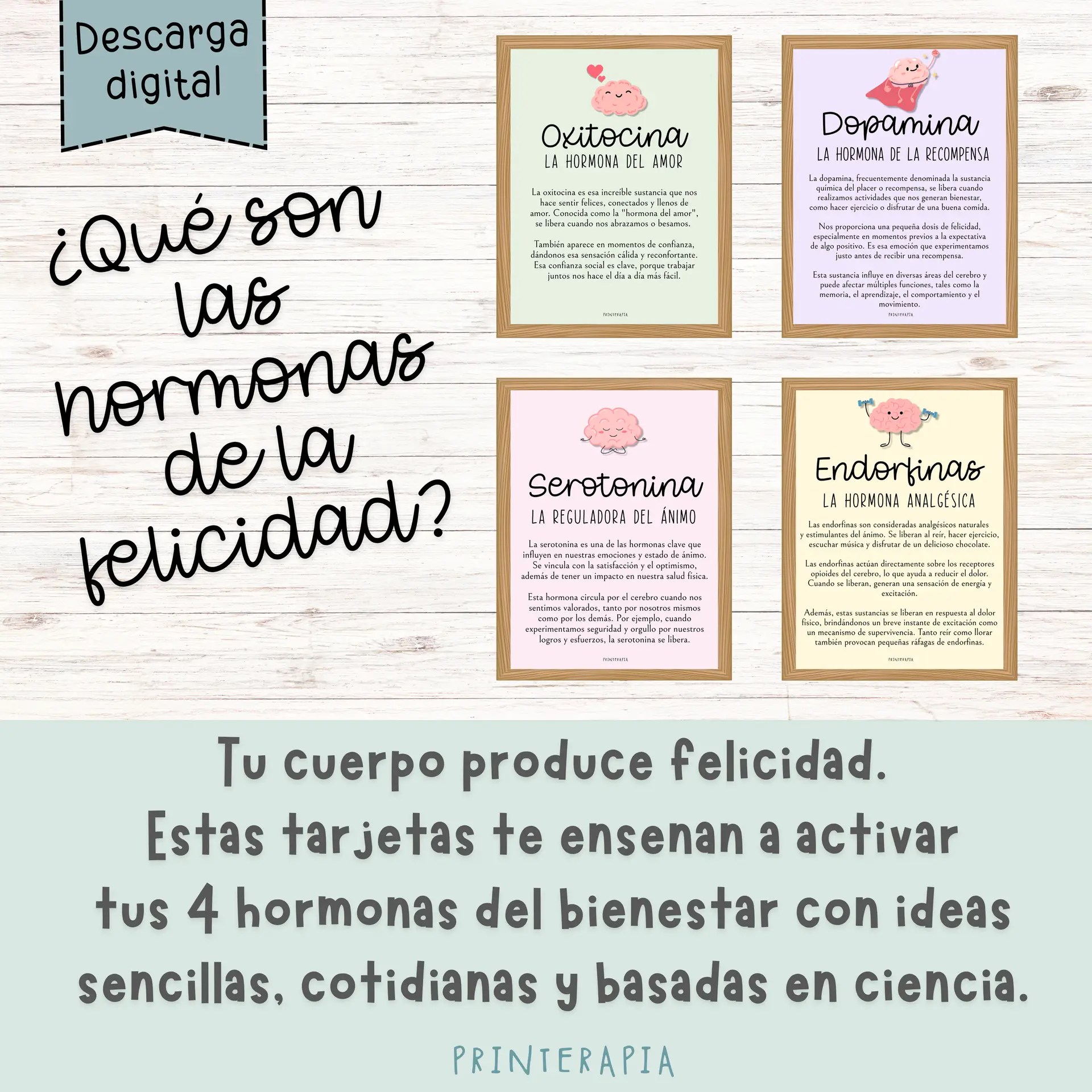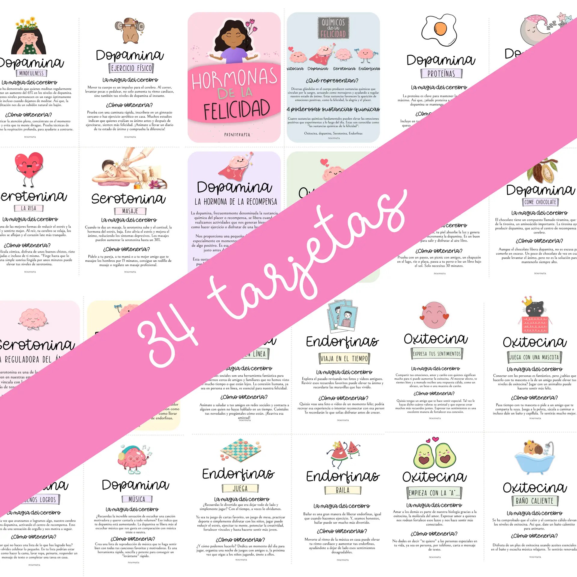 Descubre cómo activar la dopamina, serotonina, oxitocina y endorfinas con 34 tarjetas imprimibles de las Hormonas de la Felicidad: Dopamina · Serotonina · Oxitocina · Endorfinas