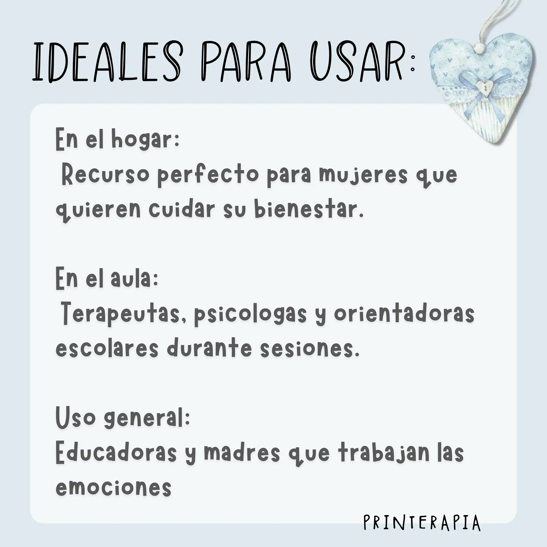 Perfectas para mujeres que buscan herramientas de autocuidado emocional, así como para terapeutas, educadoras o madres que trabajan la gestión de emociones en sesiones o en casa.